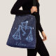 Print bag featuring the symbol for Libra in soft silver blue, overlaid with the stars of the constellation, against a starry sky background graded from deep midnight blue to black.