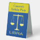 This awesome Birthday table tent sign features a digital art image of a pair of golden coloured weighing scales with the word Libra underneath in gold text. A fun design for people celebrating a Birthday born between September 23 and October 22 under the star sign of Libra. There is custom text on the front and back so you can personalise this sign with your own message.