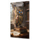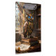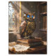 A clockwork owl with saphhire eyes is perched on a stack of books in an old library. Dust, or perhaps smoke from overheated servos, rises around it. Very nice steampunk image!