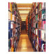 This fine art photography photo print takes you on a walk down a long aisle of books in the stacks of a huge library. The bright lighting reveals book spines in a kaleidoscope of colours: red, green, blue, black, white, gold, brown, purple. The symmetrical angle creates a geometric abstract design that seems to lead to infinity. The reflections on the freshly waxed floor contribute to the overall pattern.
