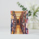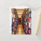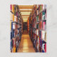 This postcard takes you on a walk down a long aisle of books in the stacks of a huge library.  The bright lighting reveals book spines in a kaleidoscope of colours:   red, green, blue, black, white, gold, brown, purple.  The symmetrical angle creates a geometric design that seems to lead to infinity.  The reflections on the freshly waxed floor contribute to the overall pattern.