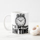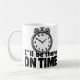 The design has a lie quote "I'll be there on time". You could imagine this being used in a humourous setting, such as on a t-shirt, mug, or poster. This kind of design plays on the universal experience of people who are habitually late, making it relatable and funny.