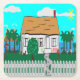 House with fence by the beach water with trees and flowers all around. The mountains settings in the background. Two women outside exercising while one woman looks out the window as the radio playing. The dog barks at the walking flamingo and the sailboat calmly passes by.