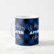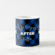 © 2022 Socialite Designs Inc. Enjoy your morning coffee with this blue and black buffalo plaid mug with the text 'Life Begins After Coffee".