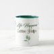 "Life Happens COFFEE HELPS" declares this true to life mug! The text is in dark green and brown, with soft green and blue leaves on either side. An additional leaf branch is directly below the lettering.
