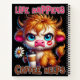 A funny and sarcastic design showcases a cute highland cow sitting with a beautiful white daisy and a to-go coffee cup. The cow, with big blue eyes and a serious expression, sports a lipstick kiss on his cheek and vibrant orange-and-white fur. The colourful text reads, "Life happens, coffee helps." This design is available on various products, making perfect gifts for coffee lovers.