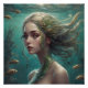 A serene aquatic scene features a woman surrounded by swirling water and fish, her hair flowing gracefully around her. Light filters through the water, highlighting her ethereal and mystical presence.