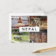 Postcard with a collage of four photos of the life and landscapes of Nepal, like temple and prayer wheels in Kathmandu, threshing grain in Bhaktapur and elephant safari in Chitwan NP.