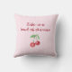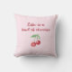 This cute pillow features a whimsical red cherry fruit watercolor illustration with green leaves on a pretty pink background. Elegant vintage script says "life is a bowl of cherries," for a chic and simple retro design.