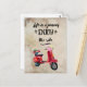 A postcard with an inspirational saying: Life is a journey enjoy the ride, written in cute handwritten fonts. Nice typography. A chic scooter painted in watercolors. Stylish unique European mode of transportation. A red moped ready to hit the road, with a cute basket of flowers on the back and a pink bouquet on the front. The background is a chic distressed looking texture with circles and random marks in a light brown colour.