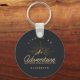A keychain with a gold coloured illustration on a black-grey background. Designed with an illustration of a mountain with the suns rays shining outward from behind. Typography says: Life is an Adventure explore dream discover.