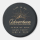 Graduation save the date memento designed with a gold coloured illustration on a black-grey background. Designed with an illustration of a mountain with the suns rays shining outward from behind. Typography says: Life is an Adventure explore dream discover.