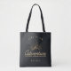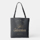 Personalised shoulder bag with a gold coloured illustration on a black-grey background. Designed with an illustration of a mountain with the suns rays shining outward from behind. Typography says: Life is an Adventure explore dream discover.