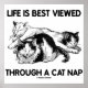 Showcase your cat attitude towards life and naps with this poster featuring three snuggling/snoozing cats along with the saying "Life Is Best Viewed Through A Cat Nap".