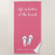 Life is better at the beach custom beach towel. Cool handlettered brush script typography print for humourous quote and cute pink heart flip flops. Unique Holiday gift ideas for men, women and kids. Pink or custom background colour. Large size for beach or pool. Create your own extra large towels for best friends, retiree, retired person, pensioner, family, husband, wife, co worker, colleague, fun boss, employee, mum, dad, sister, brother, aunt, uncle, grandpa, grandma, manager, teacher, nurse, coach, teammate, office worker, swimmer, traveller, son , daughter, teenager, vacationer, wedding couple, newly weds, newlyweds, bride and groom, mr and mrs, honeymooners etc. Big letter text template. Elegant handlettering calligraphy with pretty swirly letters. Personalise with his or her name at the bottom under the beach slippers / sandals logo.