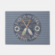 A lake house doormat featuring painted oars and lifesavers on dark wood and blue stripe background. A summer cottage home decor item to brighten your stay.