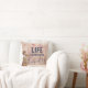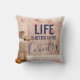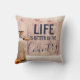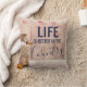 A pillow with a rustic country design. A trendy old rusting milk can. Wheat and faded red poppies in the background set against a faint wood panel. Wood is just an image, not real. Text says Life is better in the country.
