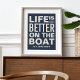 An amazing gift or cool custom addition to your boat, our frameable print features "Life is Better on the Boat" in block typography on a navy blue background. Personalise with your boat name or family name in matching lettering at the bottom.