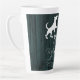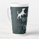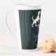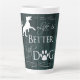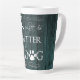 Perfect mug for those who love lattes and finds life much better when there is a dog in it. The Life is better with a Dog Latte Mug design features text that says "Life is better with a Dog." with a paw print and dog silhouette embellishment against a deep teal rustic wooden background. Additional gift items available with this design as well.