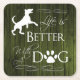 Protect your table and counter tops with Life is better with a Dog Paper Coasters. Coaster design features text that says "Life is better with a Dog." with a paw print and dog silhouette embellishment against a deep green rustic wooden background. Additional gift items available with this design as well.