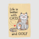 Cute funny doodle of a cat sitting up with her eyes closed, pink cheeks and tan patches. To her left are the words life is better with cats and golf in a fun black font. A small red love heart is buzzing its way down from the the letter C and the background is a beige colour.