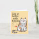 Cute funny doodle of a cat sitting up with her eyes closed, pink cheeks and tan patches. To her left are the words life is better with cats in a fun black font. A small red love heart is buzzing its way down from the the letter C and the background is a beige colour.