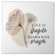 Ceramic tile depicts a simple floral line art design with two flowers on earth tone shapes. It features encouraging inspirational quote, "Life is fragile handle with prayer."