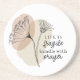 Round coaster depicts a simple floral line art design with two flowers on earth tone shapes. It features encouraging inspirational quote, "Life is fragile handle with prayer."