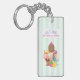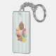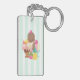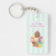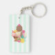 Keychain with a funny quote with an illustration of a 3 scoop ice cream sundae with colourful sprinkles. An ice cream cone with scoops of chocolate, strawberry and vanilla. A bowl of neopolitan ice cream with a cherry on top. Strawberries and a pineapple fruit sit beside the bowls. Mint green and white stripes pattern in the background.