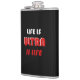 The flask itself is fine. It’s a cheap flask, obviously bought in bulk, however am prepared to overlook that. Given that it is a personalized item, I would have liked to have seen gift boxing instead of the generic packaging. Terrible printing, and/or quality. It’s a cheap, tacky vinyl. It is not cut straight and is also applied in a way that it is overhanging the bottom, causing the glue to catch on items and it will eventually roll and tear, damaging the wrap.