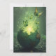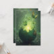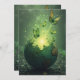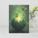 A design depicting a cracked globe emitting radiant light, with vibrant green butterflies flying towards the sky, symbolising rising from chaos and positive transformation. The combination of bright green and dark grey colours evokes a sense of hope and renewal.