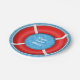 Red life preserver design on blue curley wave background to personalise for fun custom nautical themed party products.