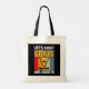 Hockey theme tote bag with hockey puck and sticks with colourful stripes and text that Life's About Goals and Assists!