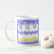 This Life's Ups & Downs Mug features a whimsical yellow and blue design of the sun and moon rising and setting along a rolling series of hills and dales, as a tiny figure shouts atop a mountain down below. Life's ups and downs. It's hills and dales. A humourous way to ponder life, while sipping a fresh cup of coffee. Or tea.