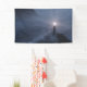 A lighthouse with a cross as the light shines out over the rocks and breakers of a mist-covered shore, showing incoming boats the way to safety.