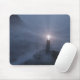 A lighthouse with a cross as the light shines out over the rocks and breakers of a mist-covered shore, showing incoming boats the way to safety.