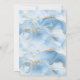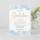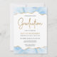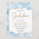 This trendy graduation party invitation features a top and bottom border of watercolor agate geode in shades of light blue with faux gold glitter highlights. The word "Graduation" appears in faux gold glitter in decorative modern handwriting font. Customise the invitation with the name of the graduate in gold coloured text and the party details in charcoal grey on a white background. A matching pastel blue and gold agate image appears on the reverse side.