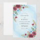 This design features a soft light blue watercolor wash paired with deep burgundy floral accents. Hand-painted burgundy dahlias and roses are complemented by icy blue anemones and delicate earthy foliage. The contrast between warm jewel tones and a cool background creates a romantic atmosphere for a winter or late autumn event.