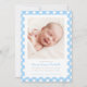 Announce the arrival of your little one to the world with this cute single photo birth announcement. It features a light blue gingham pattern on both the front and back of the card as well as plenty of room for all of the information about your newborn.