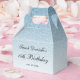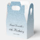 This beautiful favour box features faux glitter and your custom text. Use the template form the add your information. The "Customise Further" feature can be used to change the font and the text layout. You can also add text to the other side of the favour box.