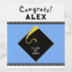 Creative graduation gift labels and party decor featuring classic black graduation cap and gold tassel design on light-blue background. To personalise edit text to add name and senior class year.