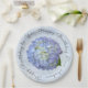 Light blue hydrangea flower custom paper plates to use for birthday party or any occasion. Script font style curves all around the edge saying, "Happy birthday to you, happy birthday dear (name)".