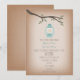 A wedding invitation featuring an illustration of a light blue camping lantern hanging from a tree with green leaves. Background is card stock inspired. Personalise the text with details of your occasion. Look for matching postage, stickers, rsvp, and other coordinating items at Jill's Paperie.