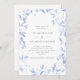 A fresh, modern wedding invitation featuring a a border of light blue watercolor leaves on a clean white background. Personalise with your details in grey.