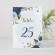 Beautiful romantic table number card featuring navy blue and light dusty blue flowers and some pretty leaves .