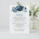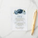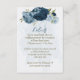 Beautiful romantic wedding reception details enclosure card featuring navy blue and light dusty blue flowers and some pretty leaves .
