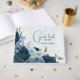 Beautiful romantic guest book featuring navy blue and light dusty blue flowers and some pretty leaves .