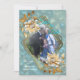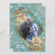 A light blue palette is before a copper/bronze Barogue-style background pattern with cream flowers and gold leaves over a diamond-shaped frame for your unique photo invitation