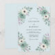 This botanical design features a serene palette of light blue and sage green, accented by delicate lavender sprigs. Hand-painted watercolor anemones and roses create a romantic arrangement around the layout. The aesthetic is perfect for a spring event, emphasizing natural beauty and a soft, airy atmosphere.