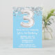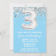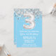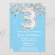 Light blue and silver 3th birthday party invitation age 3 birthday party invitation with glitter and modern script writing and fun foil balloons.